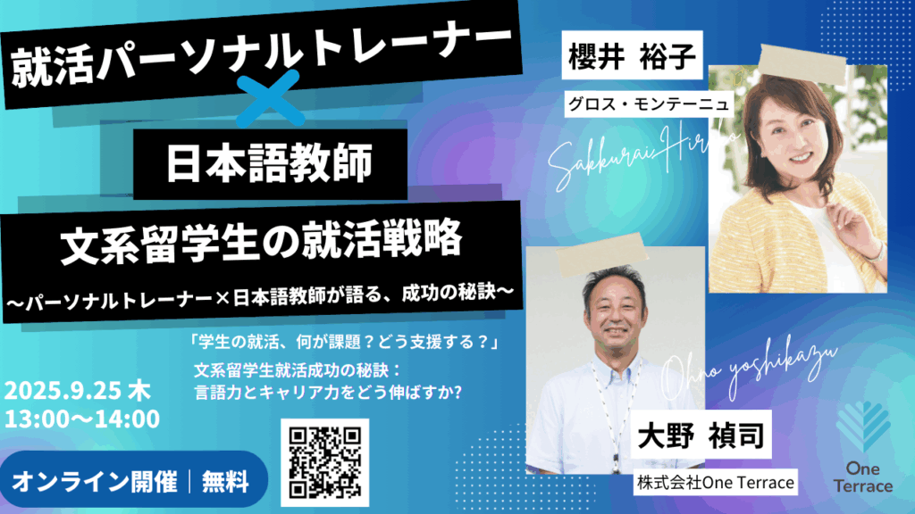 今日はセミナーのご案内です。来月9/25(木)にセミナーにでることになりました。留学生の就活支援と現状などをお話させていただきます。今回、株式会社One Terrace様と一緒に日本で働きたい留学生の就活について様々な角度から発信したいと思っております。